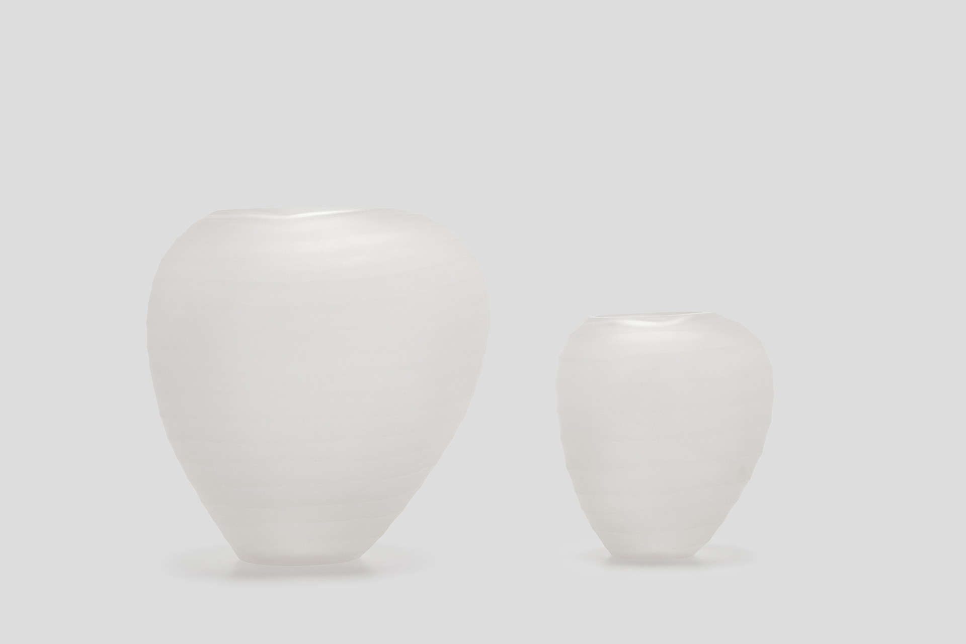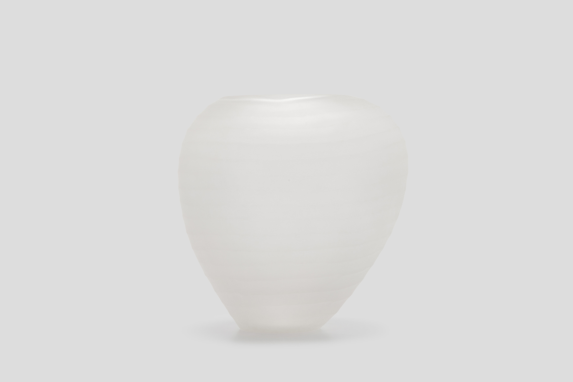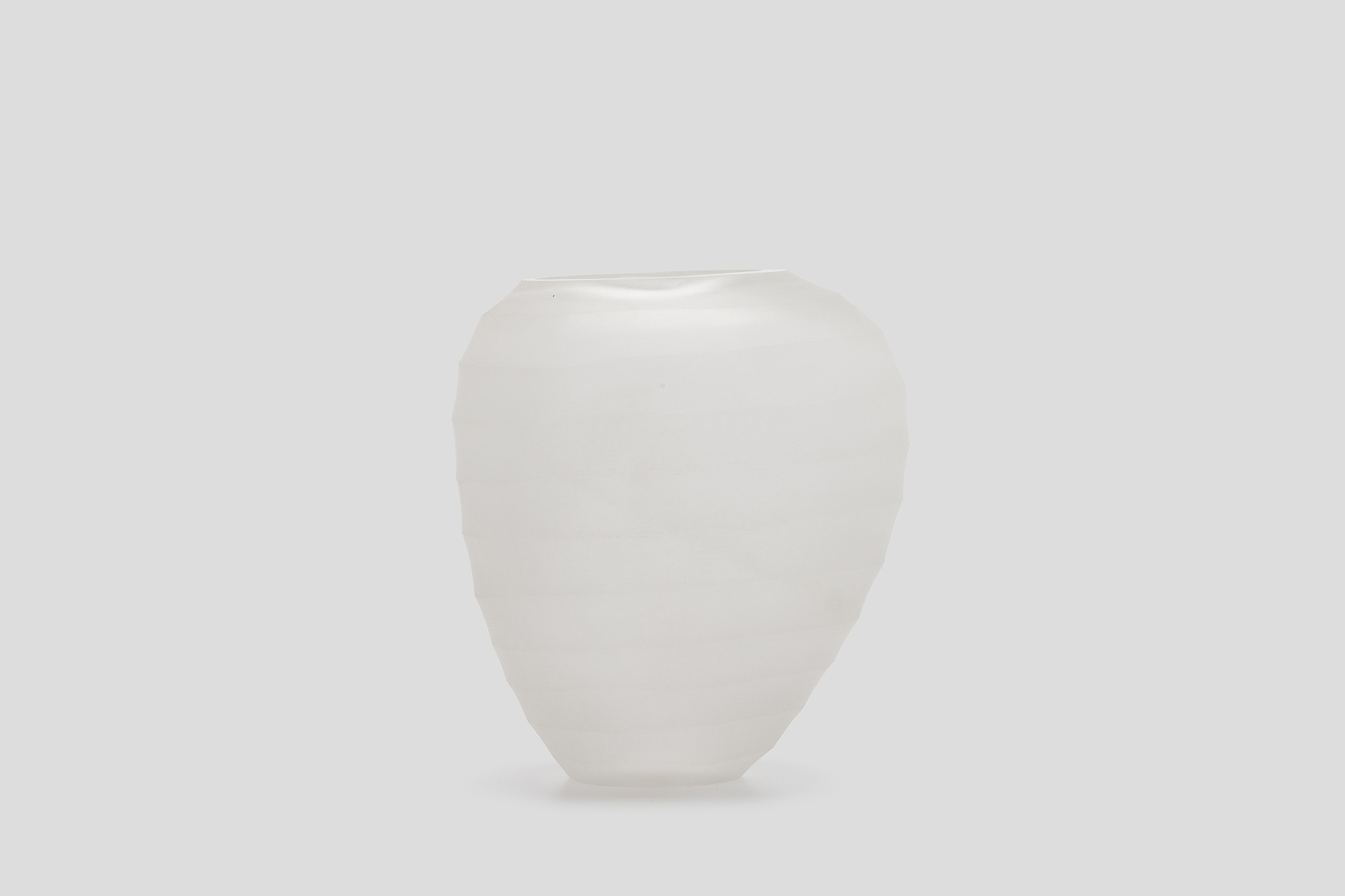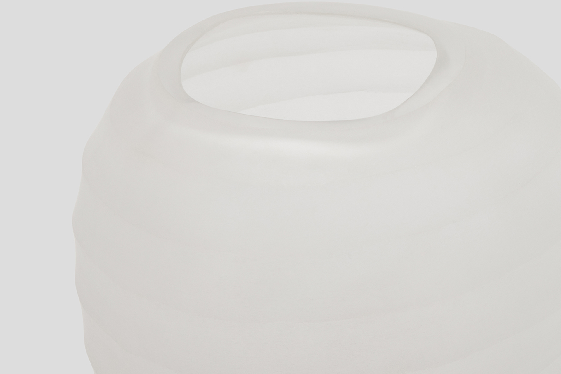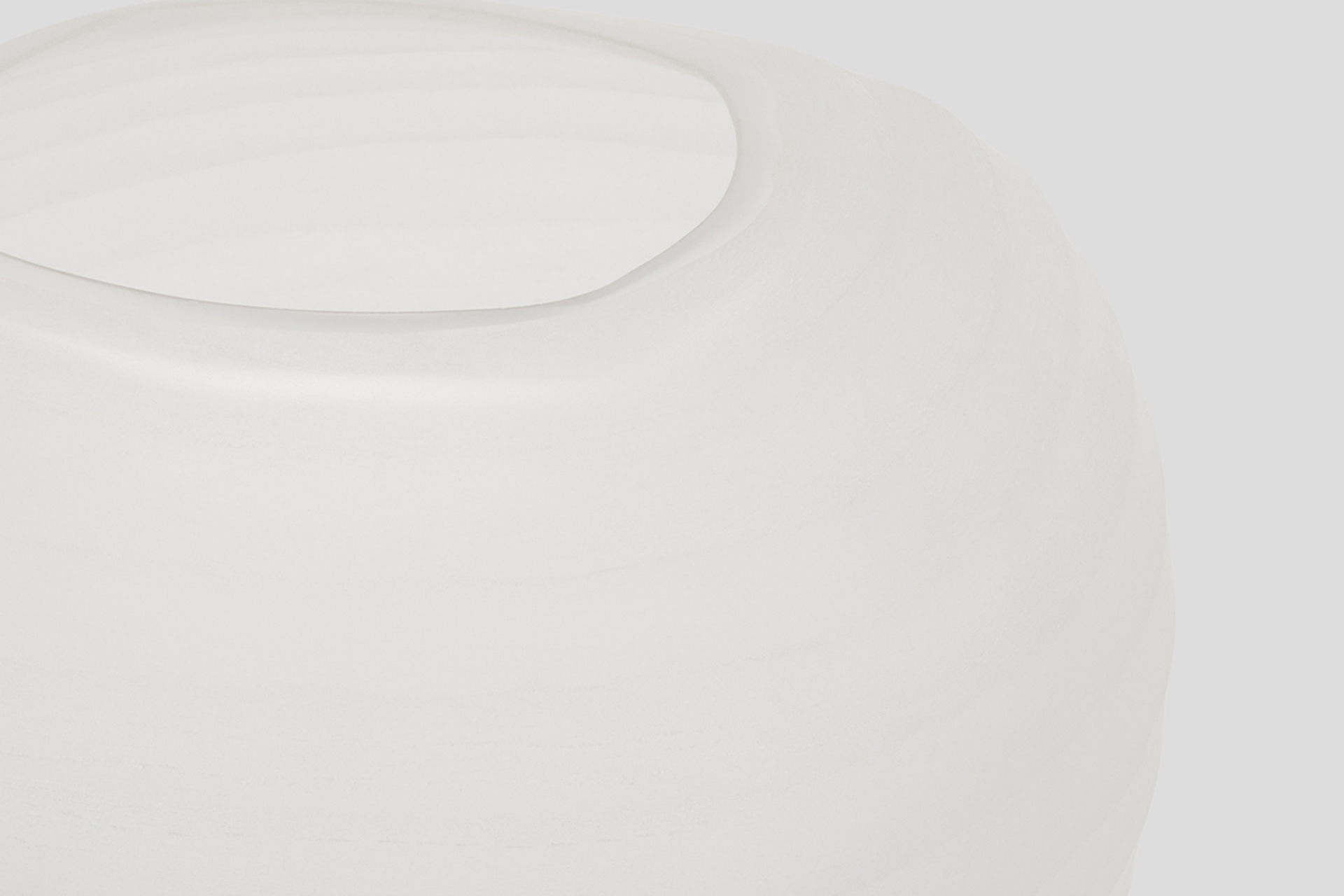The Akoya Vase features an elegantly curved, mouth-blown glass form with a textured, hand-etched surface in a frosted finish.