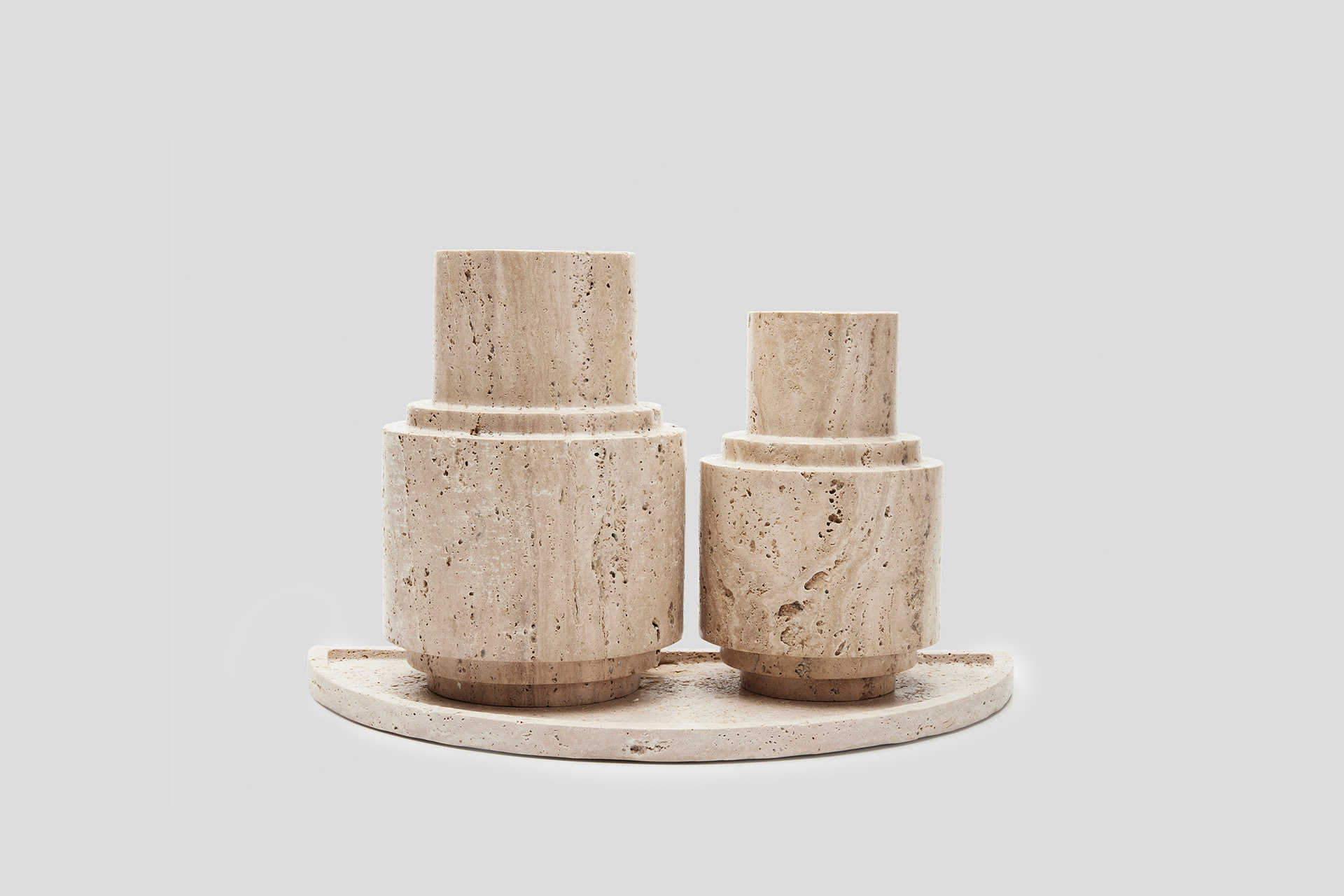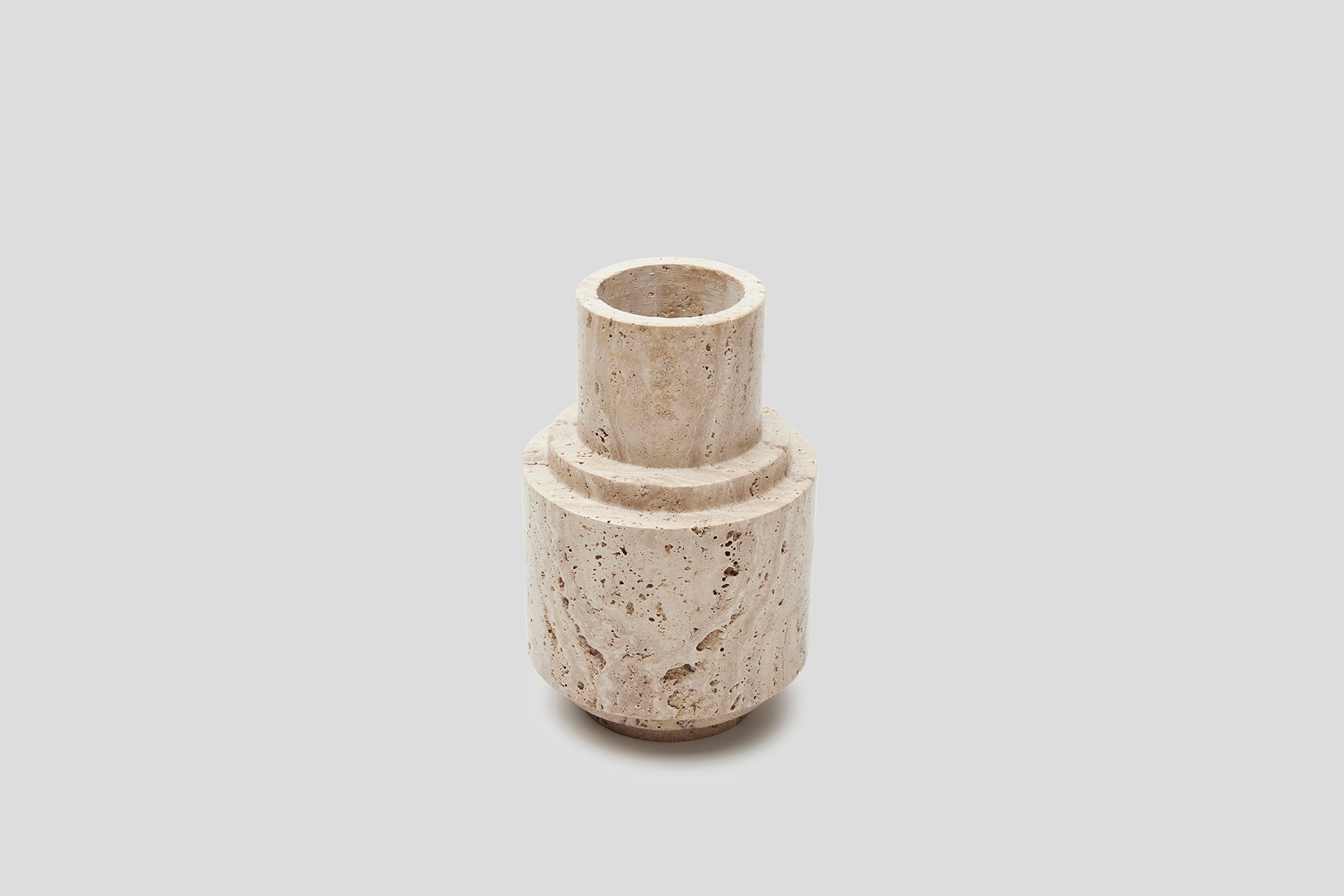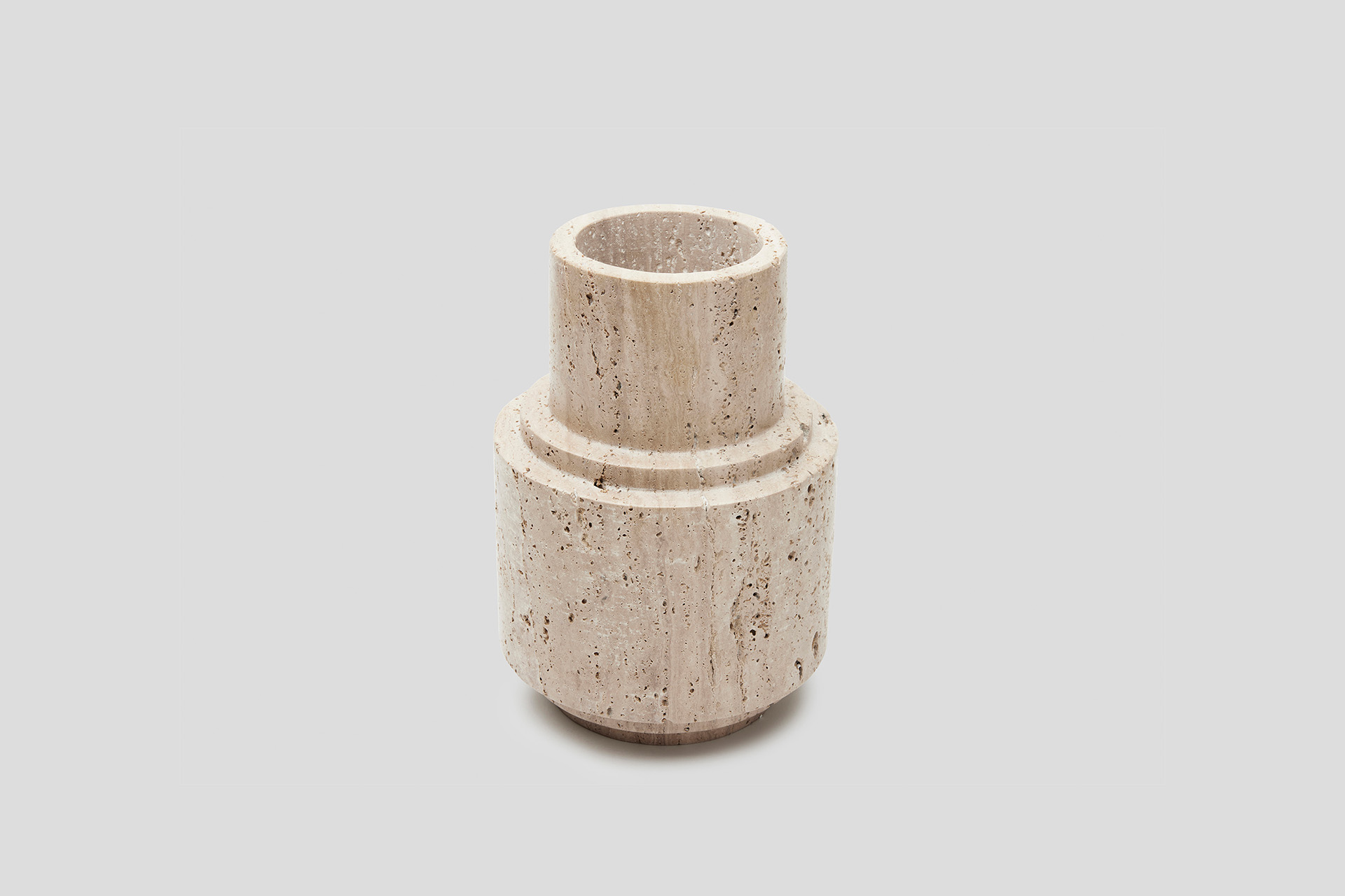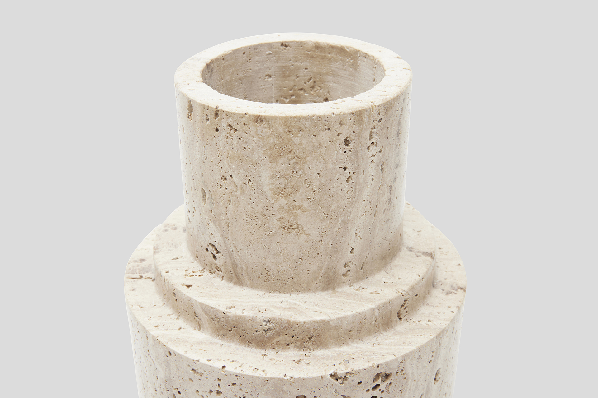 This extraordinary Pillar vase is chiselled from a solid block of Travertine like a sculpture, then meticulously polished. Travertine has porous, sandy-hues that turn any interior into a calm serene space.